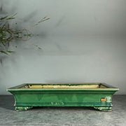 An elegant rectangular ceramic pot with a smooth glazed finish and classic feet that offer subtle elevation. Its broad inner dimensions provide generous surface space ideal for forests, multi-trunks, and medium to large bonsai such as maples, elms, and pines. The low depth ensures balanced root spread and enhances the visual harmony of mature canopies.