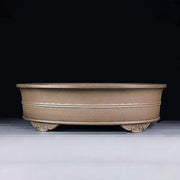 14.9" (38cm) Large Oval Beige Bonsai Pot w Mid-Body Raised Lines & Carved Feet