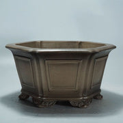 Un pot à bonsaï non émaillé raffiné, fabriqué à la main en argile de Yixing, présentant une finition dégradée à deux tons bruns et une forme hexagonale majestueuse. Les côtés à panneaux encadrés ajoutent de la profondeur, tandis que les pieds ornés et recourbés confèrent un charme antique. Parfait pour les bonsaïs semi-cascade, apportant équilibre gracieux et profondeur à votre présentation.