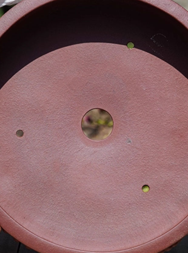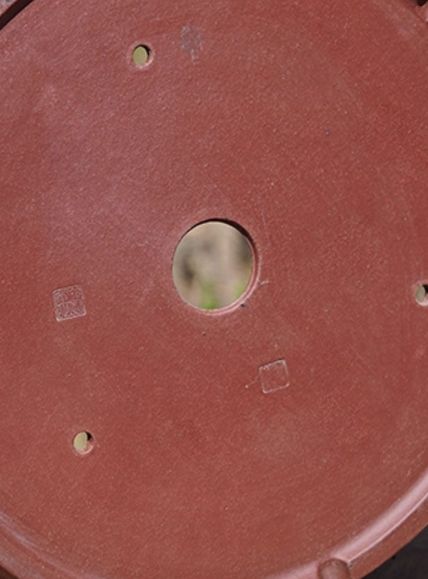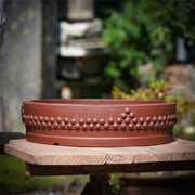 Deze grote ronde trommel bonsaipot belichaamt tijdloze kunst met zijn iconische gestikte details en evenwichtige cirkelvorm. Het roodbruine kleioppervlak straalt kracht en traditie uit, terwijl het ritmische studpatroon textuur en visueel ritme toevoegt. Perfect voor grote rechtopstaande of meerstammige bonsaicomposities, biedt het een indrukwekkende uitstraling.